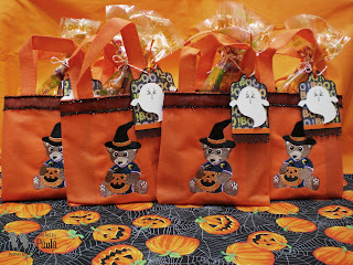 The bags are actually cheap ones I picked up at Michaels. (I think they were about 10¢/ each). I just embroidered a little design and added some ribbon to them. I made 6 each of the witch, the pumpkin, the Teddy Bear and Frankenstein.